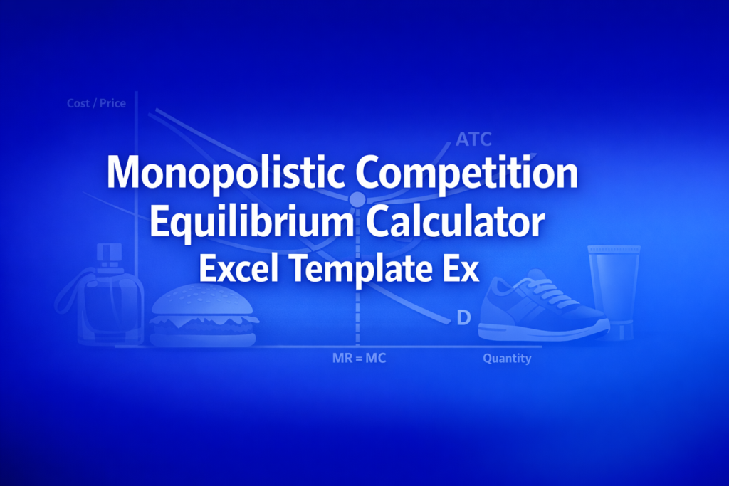 Excel template for monopolistic competition equilibrium. Calculate SR/LR quantity, price, profit, excess capacity, and markup with live formulas.